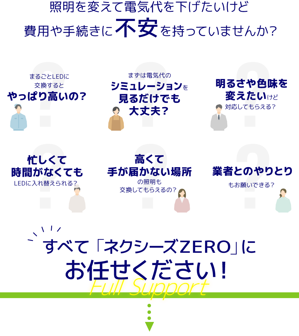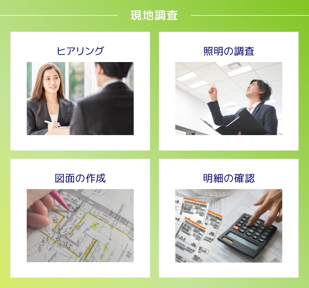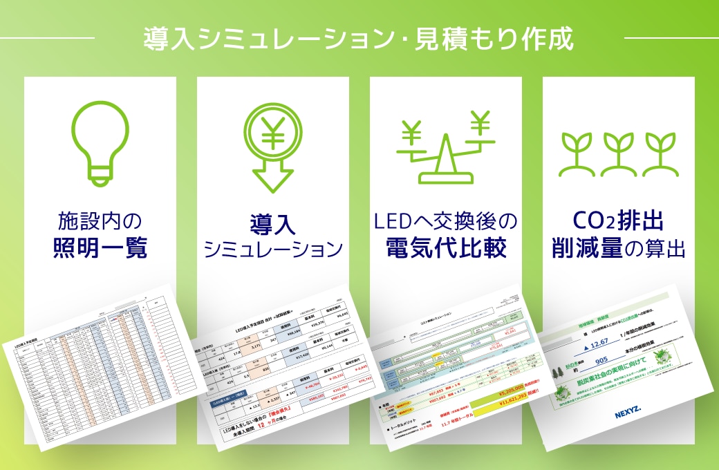 「ネクシーズZERO」では、スタッフが店舗や施設を直接訪問して詳細な現地調査を行い、詳細な導入シミュレーションを無料で作成しております。お客様のお困りごとやご要望を詳しくヒアリングし、施設に合わせたLED導入プランをご提案いたします。