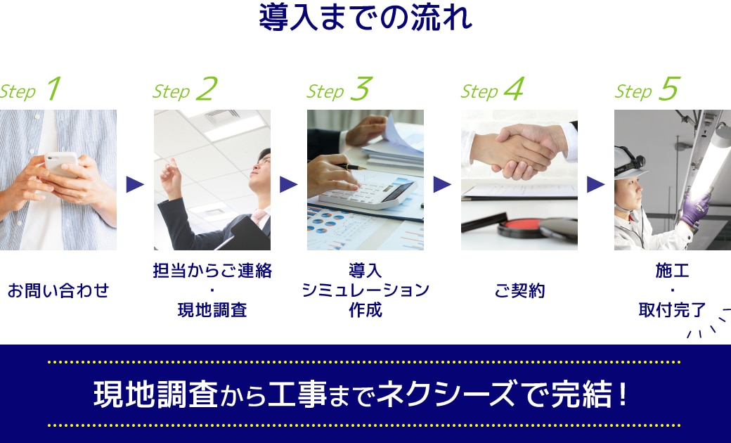 商品の選定から設置工事の手配まで、すべての工程を「ネクシーズZERO」が担当します。工場の高天井・外灯・看板照明など、高い場所の照明も、経験豊富な技術者が対応するので安心です。