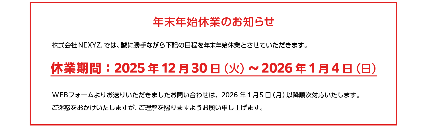 ※お預かりした個人情報は、株式会社NEXYZ.からのサービス説明、サービスに関する書類の発送など、サービス提供に必要な業務の遂行の目的のみ利用いたします。
