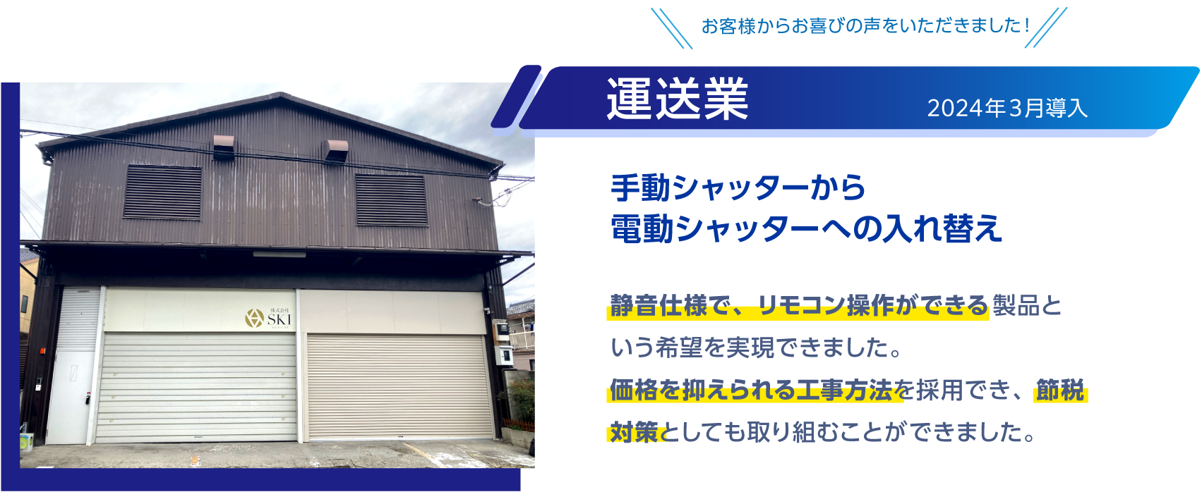 店舗・工場・商業施設などさまざまな業種に対応できる電動シャッターを取り扱っています。